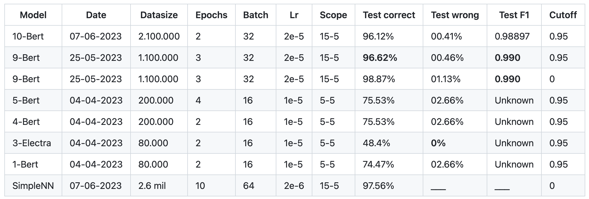 Spellchecking is a big project on its own and way too much to cover here. I might do another post on that someday. I tried many different approaches: simple spellcheckers, n-grams, word embeddings, and gpts. I ended up using a mix of a simple spellchecker formula by Peter Norvig (this is btw an amazing read and I would highly recommend it) and the specific issues around Danish spelling allowing me to give good educated guesses on where the issues in the spelling might be.