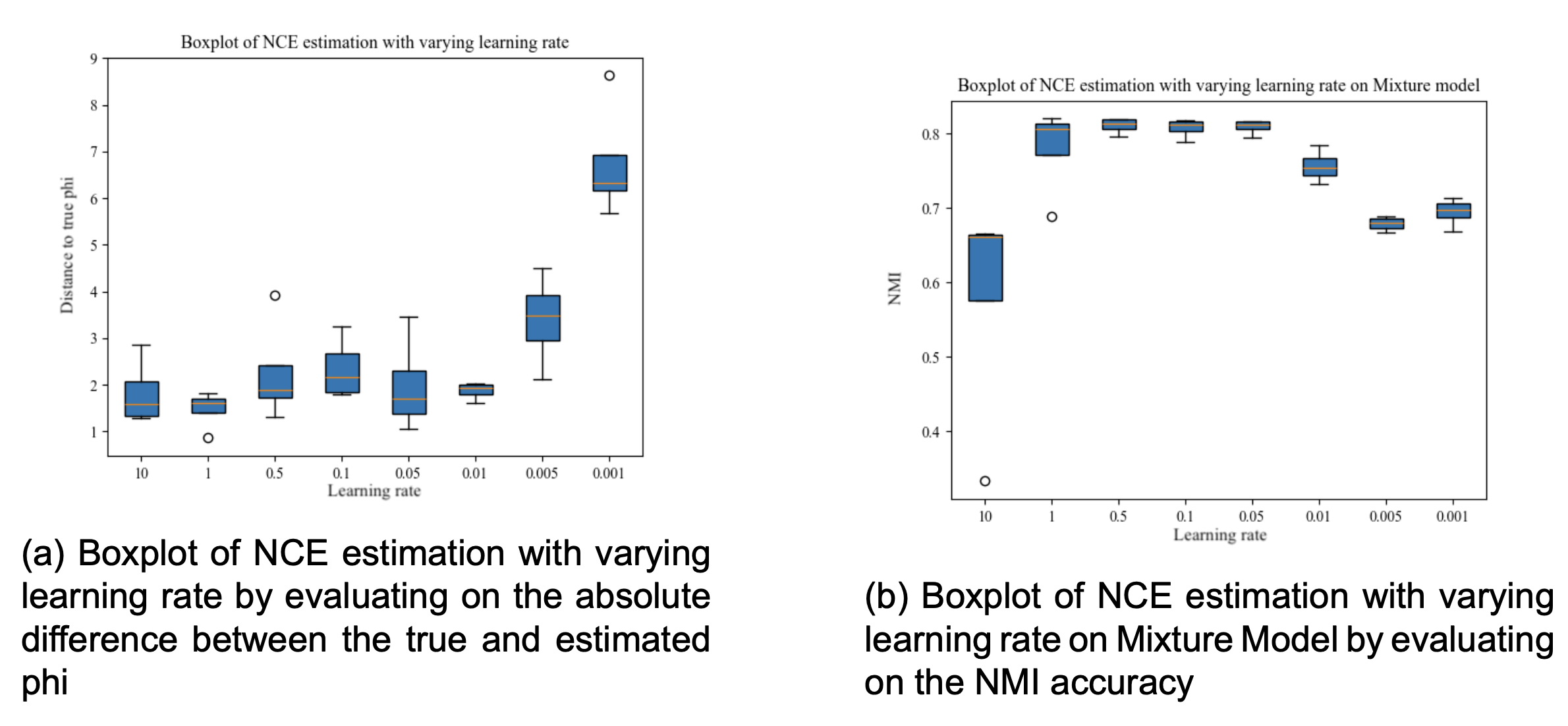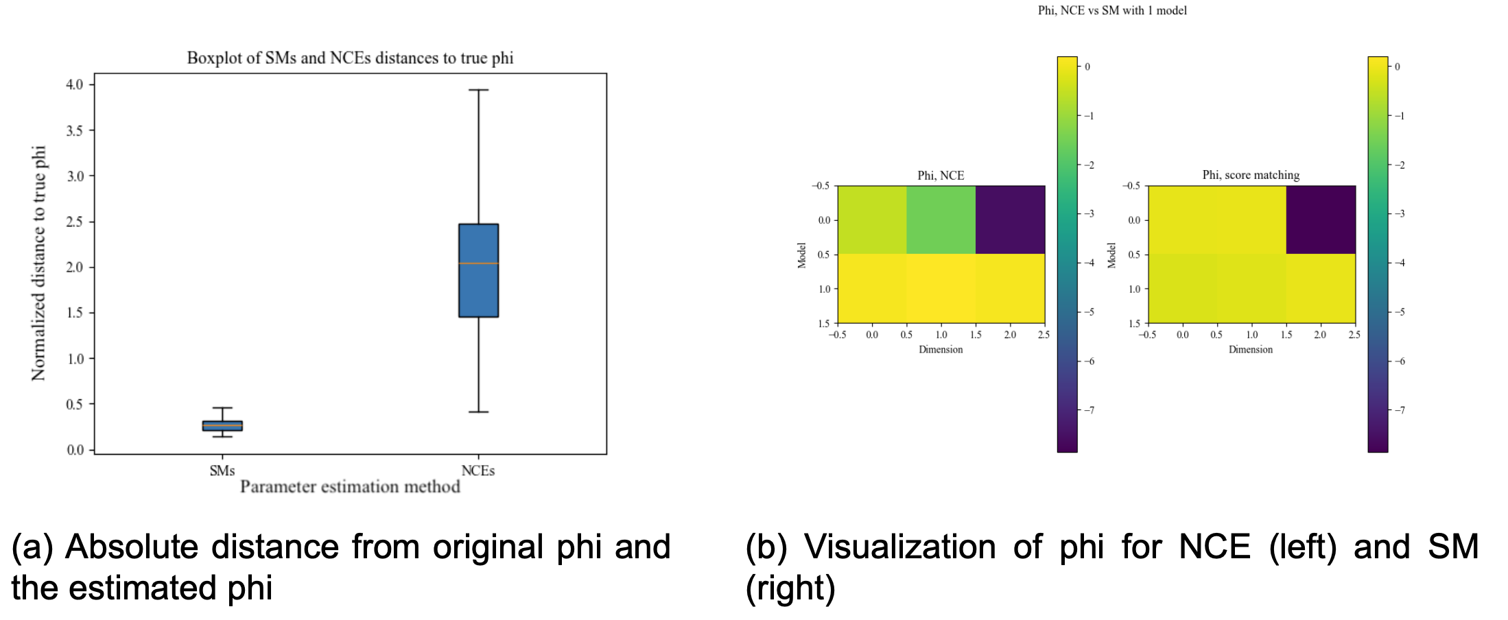It is rather obvious that NCE performs not only more poorly, but is way more unstable when estimating the ϕ-matrix. This is supported by running a Wilcoxon signed-rank test (p-value: 0.00196). As NCE is our only option going forward with mixture models, we have to use the worse estimation method here. A future opportunity would be to use the idea of Score Matching to perform parameter estimation on mixture models.