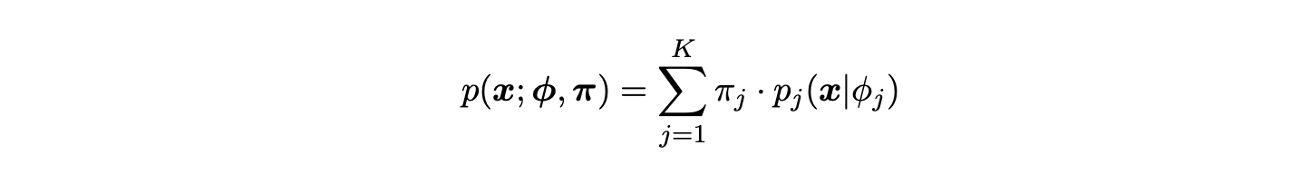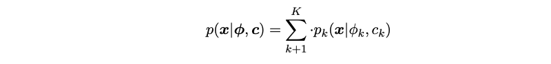 Where c = (c1, ..., cK ) with 'c_k = log(π_k) - logZ(ϕk)' and each 'p_k(x|ϕ_k, c_k)' is defined as: