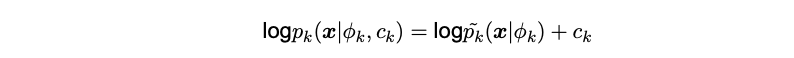 To estimate the non-normalized mixture model, an extension is made of NCE. Equation 2.4 is reparametrized, where the parameter ck incorporates both the mixture weight πk and the normalization constant Z(ϕk):