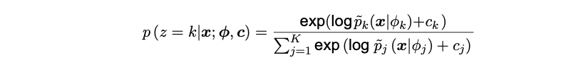 Here the notations is identical to the previous, where the estimated parameters are still ϕ and c. p_k(x|ϕ_k) represents the density function for the torus graph component k as seen in the third equation presented in the NCE part. Moreover the above equation returns a probability of the data belonging to a specific component, thus enabling clustering.