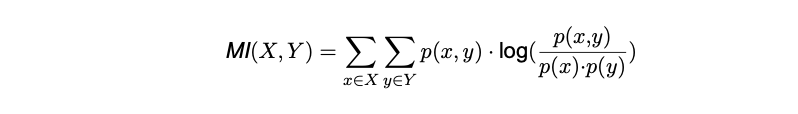 Where p(x, y) represents the joint probability distribution and p(x), p(y) represents the marginal distributions.