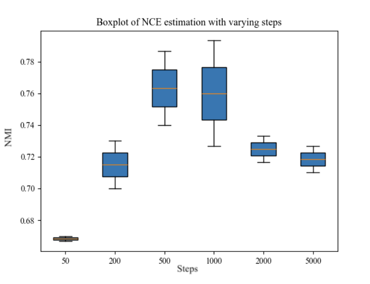 500 and 1000 steps is the best option with both less and more steps having a tendency to decrease the performance of the mixture model. The fact that more steps can decrease the performance is quite interesting, and I'm not really sure why this happens. Sure, the model can overfit, but the evaluation NMI metric is based on the overall fit of the model on the training data, so it's this behaviour is quite strange. This might be one of the reason why the overall performance is bad, and something that could too be investigated later.
