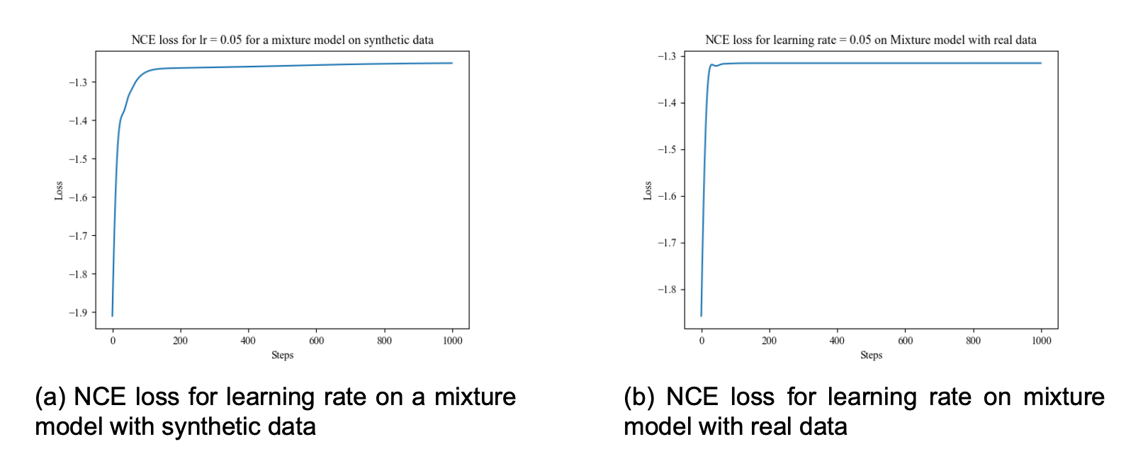 A majority vote classifier baseline model performs only slighty worse than our trained mixture model. Bad! The difference between the distributions for each result is only slighty different. The model has an extremely hard time fitting to the data. As discussed previously this could be due to the estimation method, NCE, not being good enough. To investigate a bit more, we can look at the loss curves for both the synthetic data and real data run.