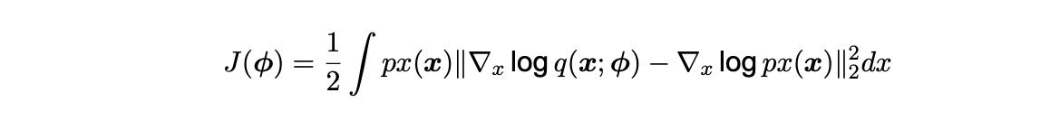 Here p(x) denotes the model score function and q(x, ϕ) denotes the data score function. The objective function is a measure of expected squared difference between the model and data score function. As shown by Klein 2020, the score matching objective function for torus graph models, under some mild regularity assumptions, can be expressed as: