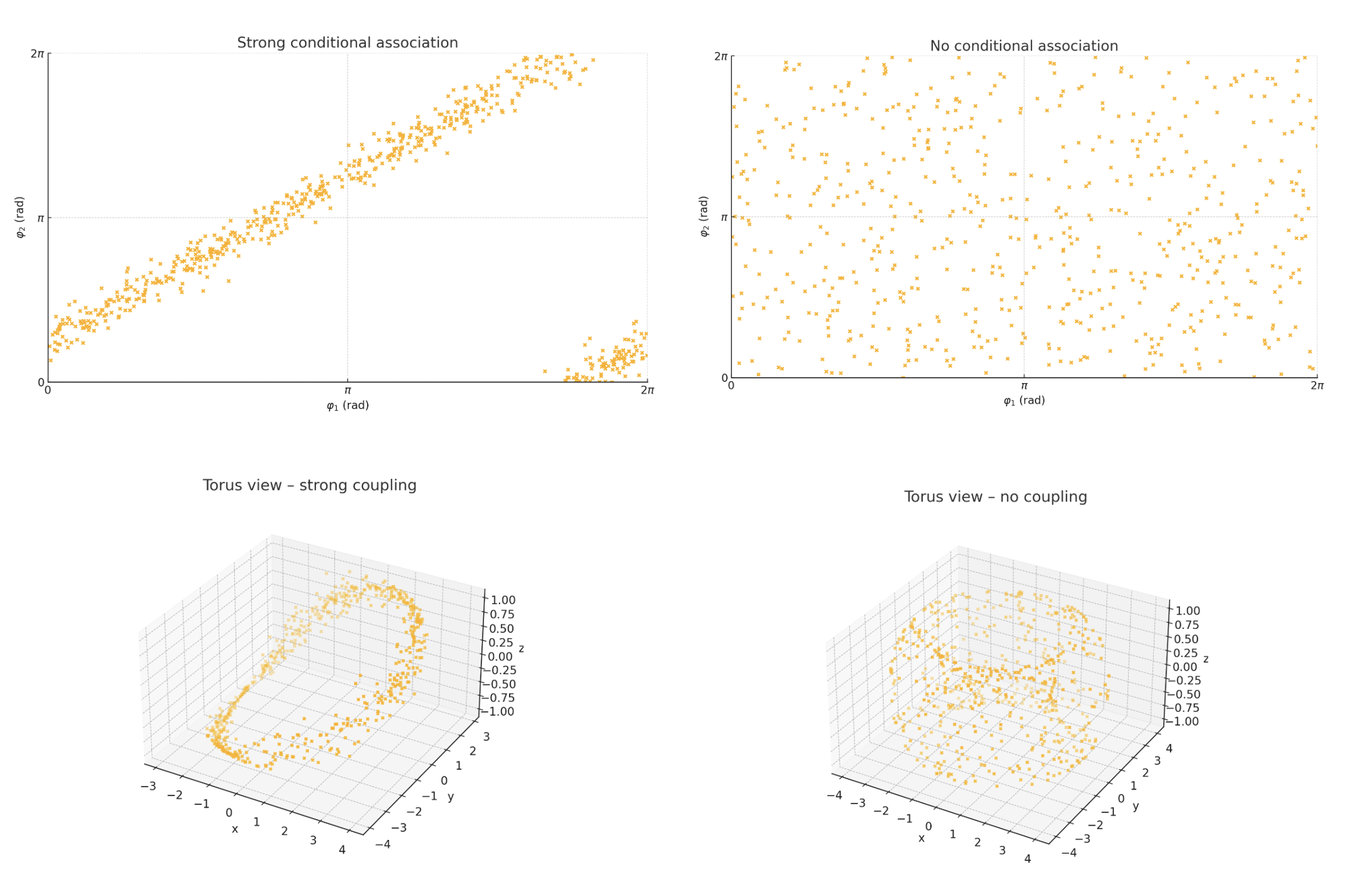 If the two signals have a strong conditional association, the phase angles will be close to each other most of the time. This will not only produce a nice scatterplot, but also a nice torus (donut-shaped in 3D space), and the opposite for no association. We can simulate this using a vonmises-distribution (not relevant here, just often used for circular distributions). We can then plot the phase angles first on a scatter, then as a Torus. When plotting two circles, we need 3 dimensions to visualize properly.