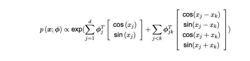 Generally, the model represents the product that lies on the torus graph. The density can, much like a multivariate normal distribution, be assumed to be part of the exponential family. The first sum represents the phases themselves as well as their coefficients, whereas the second sum represents the phase differences and phase reflections. However, assuming that the phases are uniformly distributed, one can also shy from the phase reflections.
