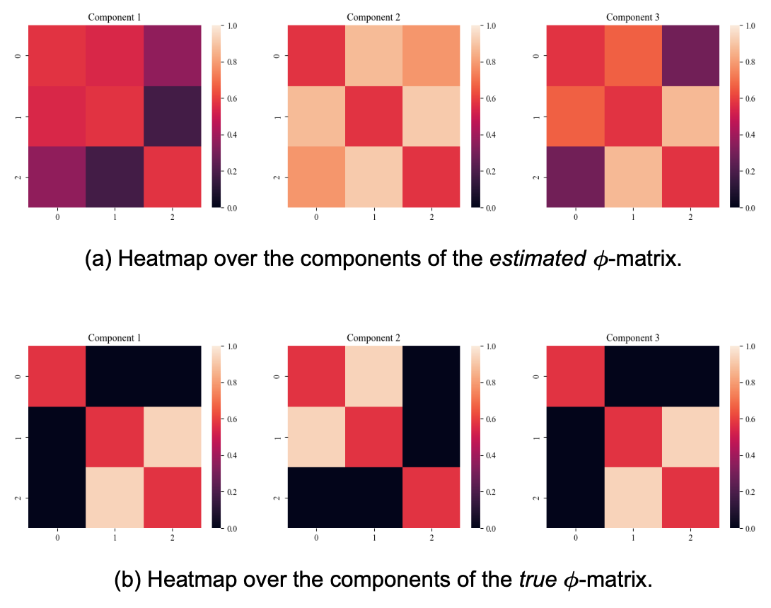 When fitting a mixture model of 3 components to synthetic data sampled from 3 models, we can compare the true ϕ-matrices of torus graphs we draw from to the ones we estimated in each of our components. The true component 1 and 3 look alike, but are different in that they have different signs. Ignored Indexing as it is irrelevant, the estimated ϕ values are decent (est. 2 -> true 1, est. 1 -> true 2 & est. 3 -> true 3). Again, we would expect this to be rather perfect, as this is a fairly simple task. This suggests that NCE might not be the best method to do the parameter estimation, or that we otherwise have to optimize it somehow. This is not something I will pursue here, but it should be remembered going forward.