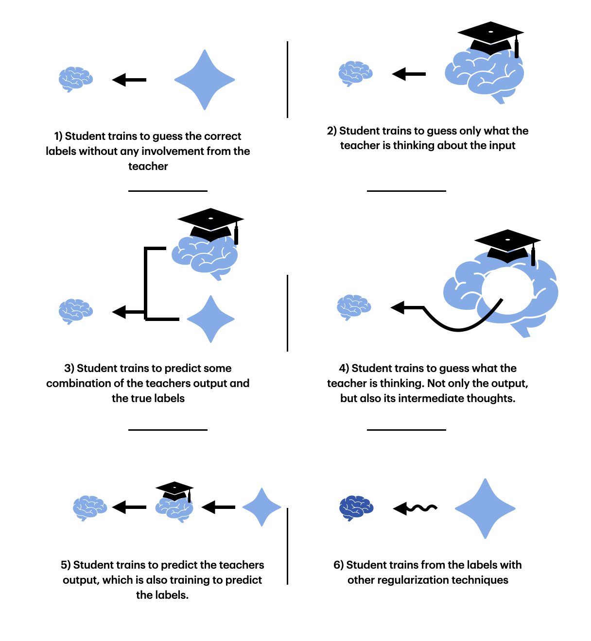 There are many different ways to fit the student, and we have to investigate multiple to ensure we have enough results for a proper conclusion. This involves: 1) training a student only from the labels (so without a teacher), 2) training from only the teacher, 3) training from partly the teacher and partly the labels (some avg tensor with some weighting), 4) training from teacher but with an intermediate loss, 5) training the student and the teacher from initialization together (end-to-end) and 6) training a student with other forms of regularization (dropout, weight-decay, etc).
