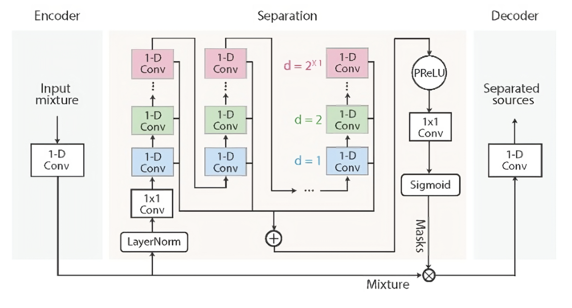 The figure above shows the model architecture of the ConvTasNet. The encoder converts the raw audio waveform into a learned feature representation by applying a 1D convolution with a trainable filter. This allows the model to work directly on the time-domain signal while still benefiting from a form of learned time-frequency representation.