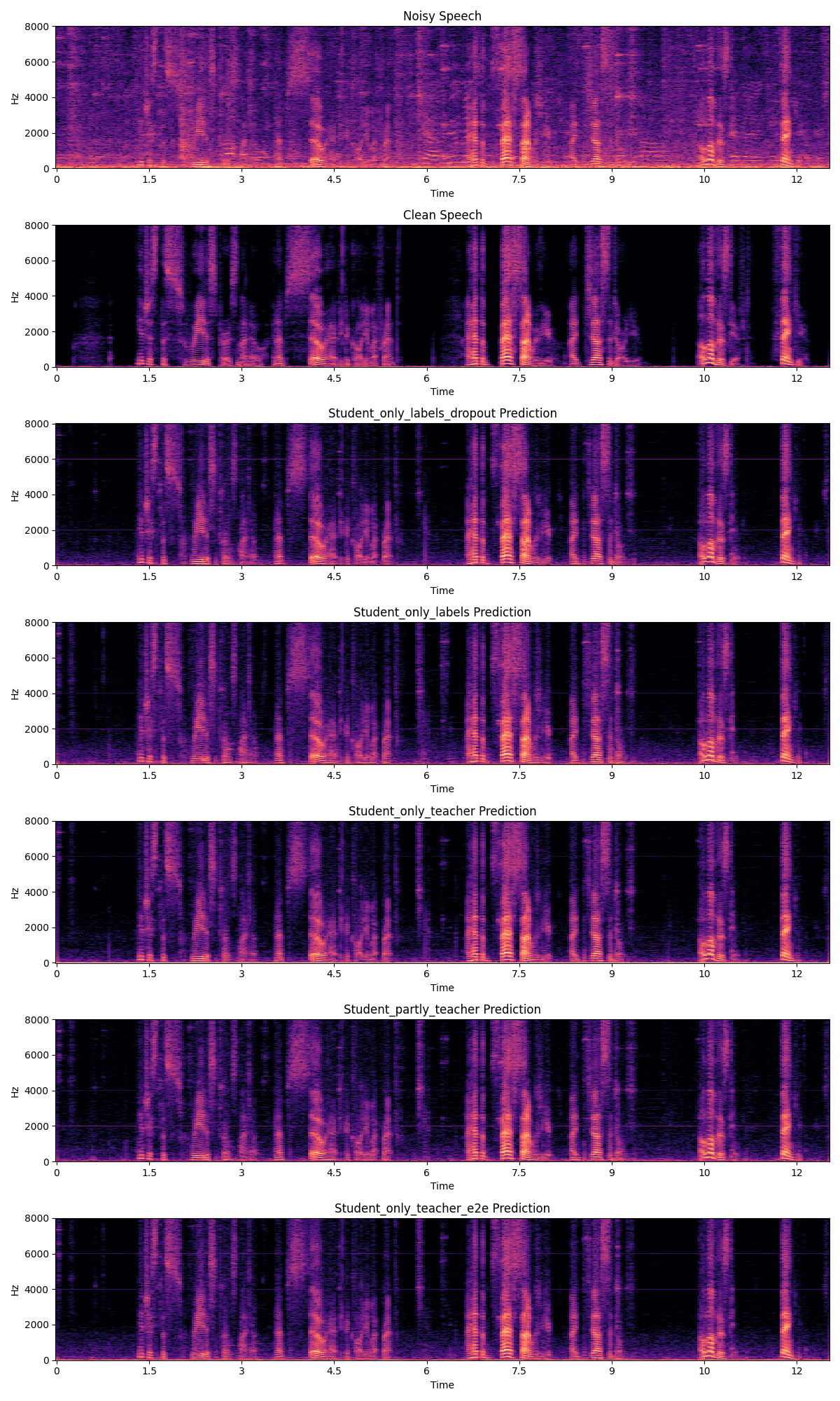 In the end, we ended up with multiple models that could in principle be deployed on phones to decrease noice on calls. With regards to the teacher-student framework, we partly succeeded. We showed that yes, the framework improves the performance of the final model when compared to just training directly on the labels. We also show that the main functionality of this teacher is to serve as regularization, and other methods exist to perform this feature without the need for spending compute time on training a teacher.