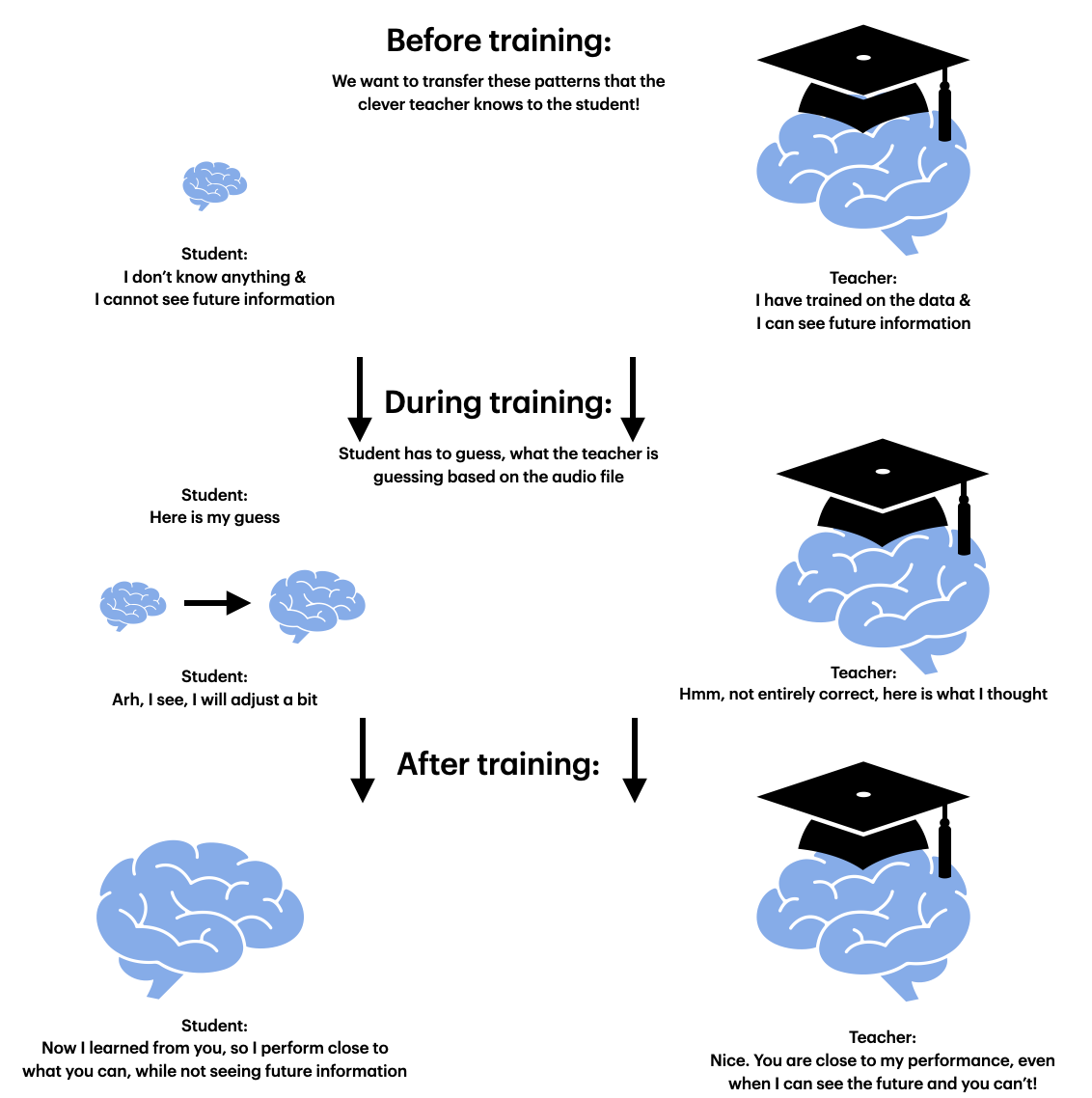 How do we train a causal (no future information) model most effectively to have great performance? One idea is to use knowledge distilation: We take a non-causal, well-trained model, which will act as the teacher, and we use this to train a causal model (student). This is a classical teacher-student framework, a technique used when training mostly smaller models but wanting close to the same performance as the teacher provide.