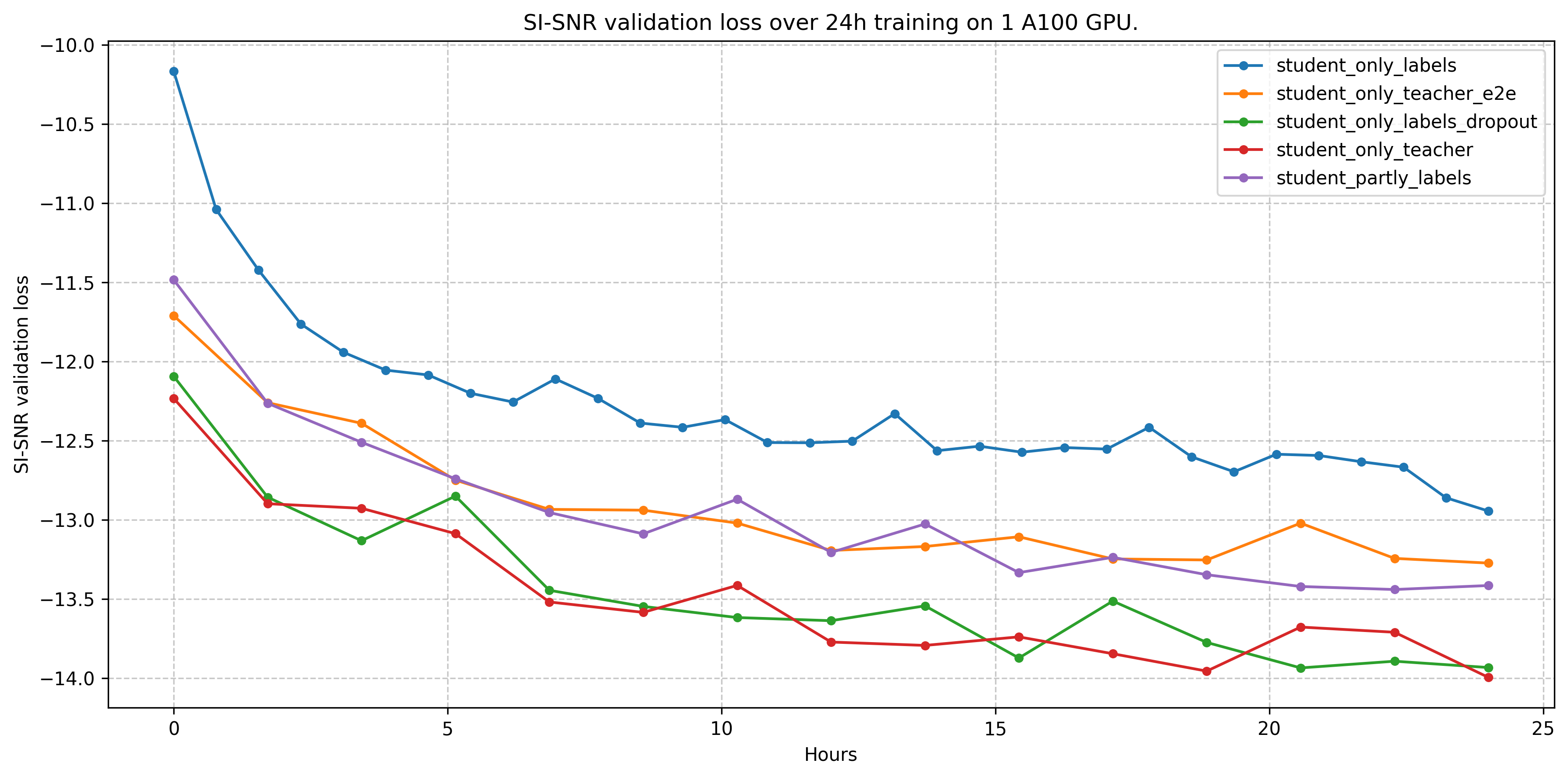 The first image shows the validation SI-SNR score when evaluating on the entire validation set over the training across each of our 5 models. We train each model for 24 hours again on a single A100.